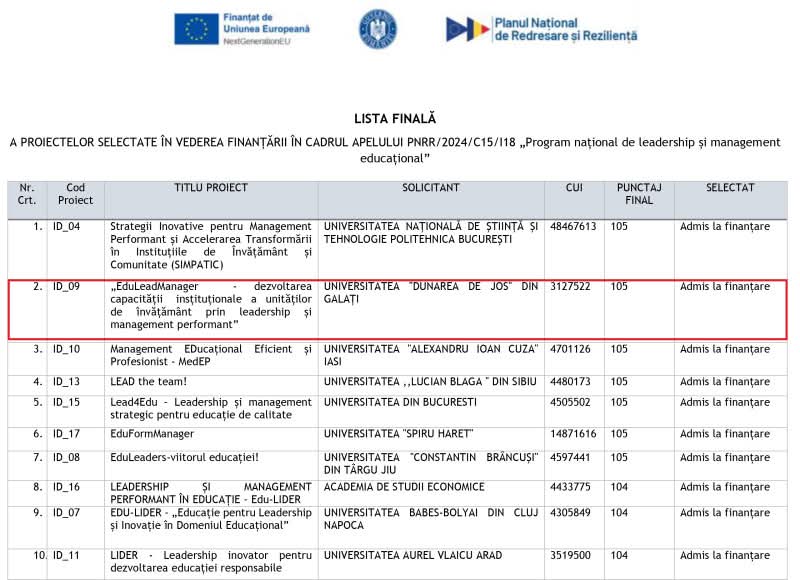 Casa Corpului Didactic ”Simion Mehedinți” Vrancea – parteneriat cu Universitatea ”Dunărea de Jos” din Galați Casa Corpului Didactic ”Simion Mehedinți” Vrancea este partener în Proiectul PNRR ”EduLeadManager – dezvoltarea capacității instituționale a unităților de învățământ prin leadership și management performant”, proiect câștigat de Universitatea ”Dunărea de Jos” din Galați, în competiția națională lansată în cadrul Programului Național de Redresare și Reziliență v- Componenta C15 – Educație. Activitățile din cadrul proiectului EduLeadManager vor avea ca rezultat formarea a 1125 de manageri de unități de învățământ preuniversitar, inspectori școlari și alte categorii de personal cu funcții de management instituțional. Mulțumim echipei de management a proiectului din cadrul Universității ”Dunărea de Jos” Galați, reprezentată prin doamna prof. univ. dr. Simona Marin, pentru colaborarea cu CCD Vrancea, în vederea implementării acestui proiect atât de necesar managerilor din sistemul de educație în contextul noilor schimbări din învățământul preuniversitar. Clic aici pentru lista proiectelor selectate. DIRECTOR CCD VN- Gabriela-Daniela MARCHITAN